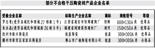 本報訊記者龔漢斌報道:近日,江西省質監局公布了近期對干壓陶瓷磚產品進行省級產品質量監督抽查的結果。質監部門共抽查了51家生產企業生產的52批次產品,抽樣合格率90.4%。抽查結果表明,本次抽查的陶瓷磚其放射性核素限量指標均達到了標準規定的要求;但仍有部分產品存在一些問題。 本次抽查的5批次不合格產品中,有1批次產品的破壞強度達不到標準規定要求,兩批次產品的斷裂模數指標達不到標準規定要求。強度性能指標不達標易造成產品達不到應有的承重能力,在使用中產生開裂、破碎或表面缺陷等現象,影響產品的使用壽命和使用性能。有4批次產品的吸水率達不到標準規定要求。吸水率不達標,將影響消費者的正常使用。 對本次監督抽查不合格的產品,省質監局將依法嚴肅處理。